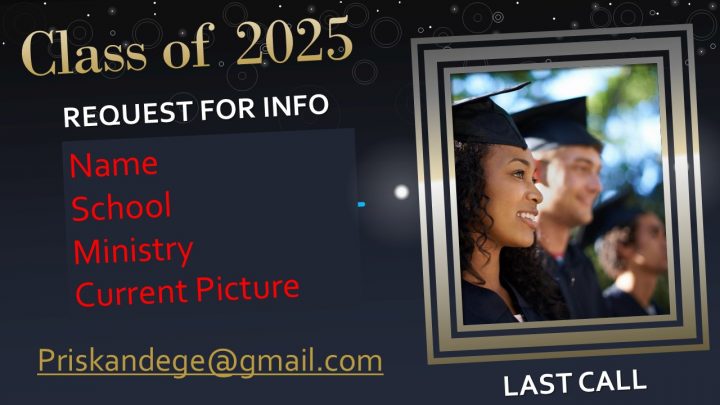 We are preparing to honor our graduates during a special recognition ceremony—and we don’t want to miss anyone! If you or a family member is graduating from elementary, middle school, high school, college, or post-grad studies and would like to be included, please submit the following to Sister Priska at priskandege@gmail.com no later than May 30th:
